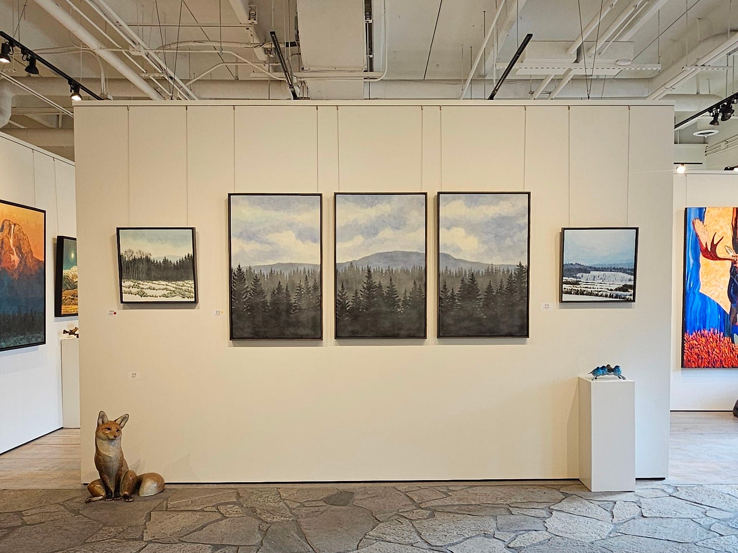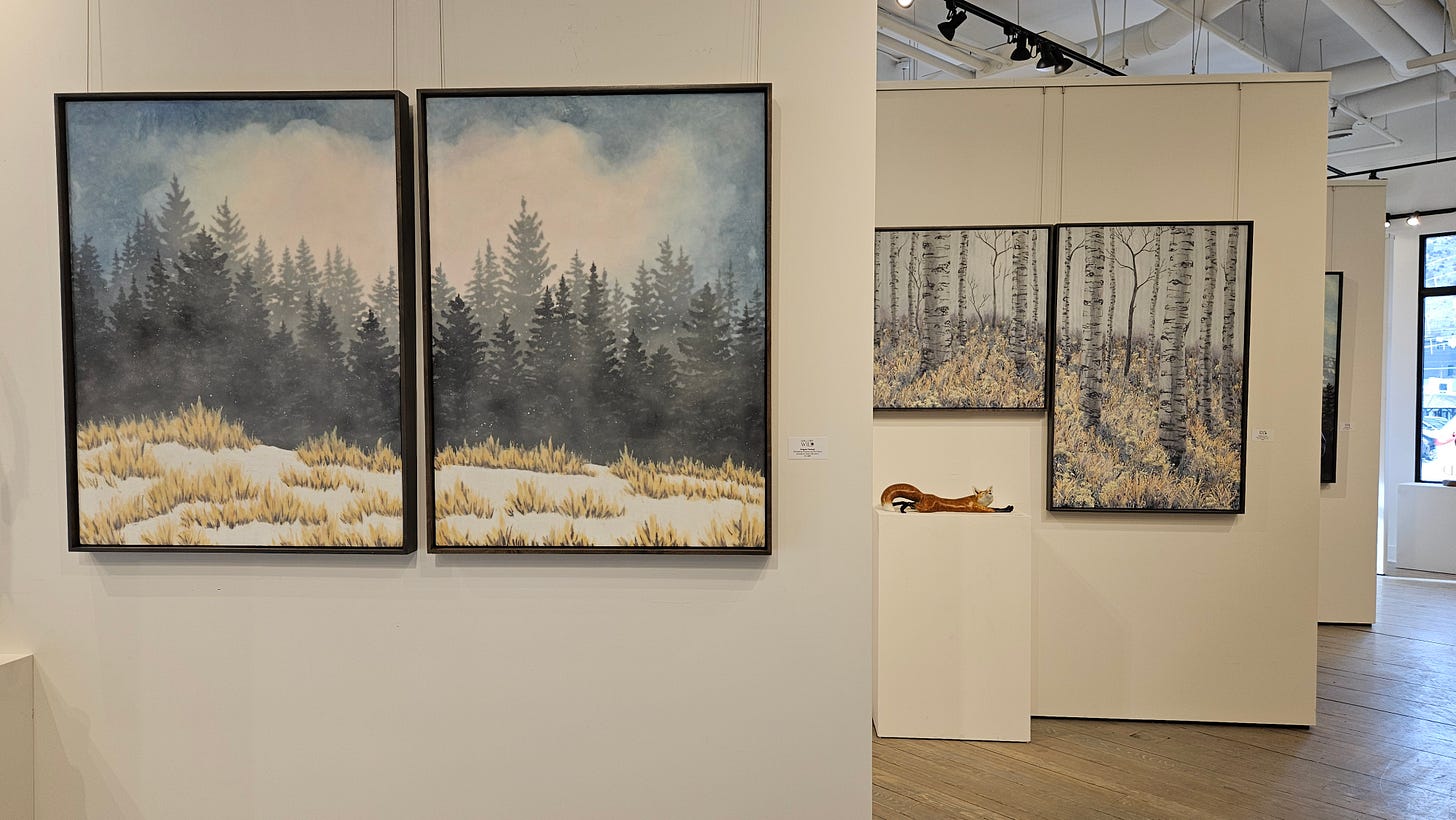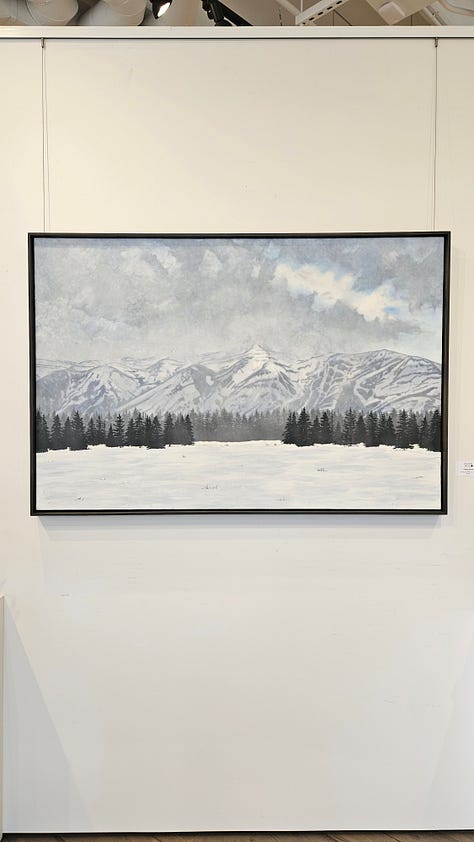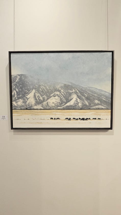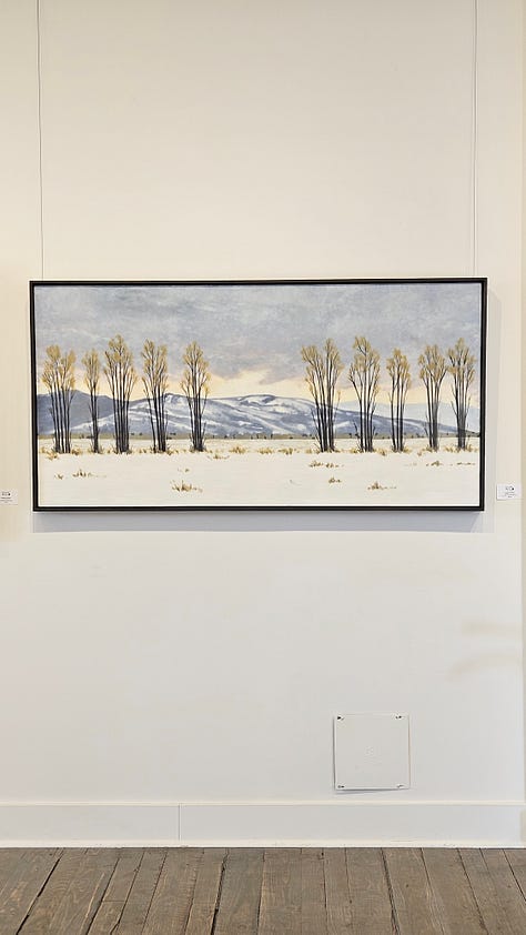 We have returned from Jackson and my show at Gallery Wild and had a lovely time, and I was pleased with initial sales, and especially happy at how all of it looked hung up in the gallery. Again, kudos to the wonderful people at Gallery Wild for all their hard work, especially owner/artist Carrie Wild. We took a lovely walk inside Grand Teton National Park, skied at Jackson Hole, spent a lot of time in the hot tub of our hotel, and ended the trip at a favorite hot spring on the way home.